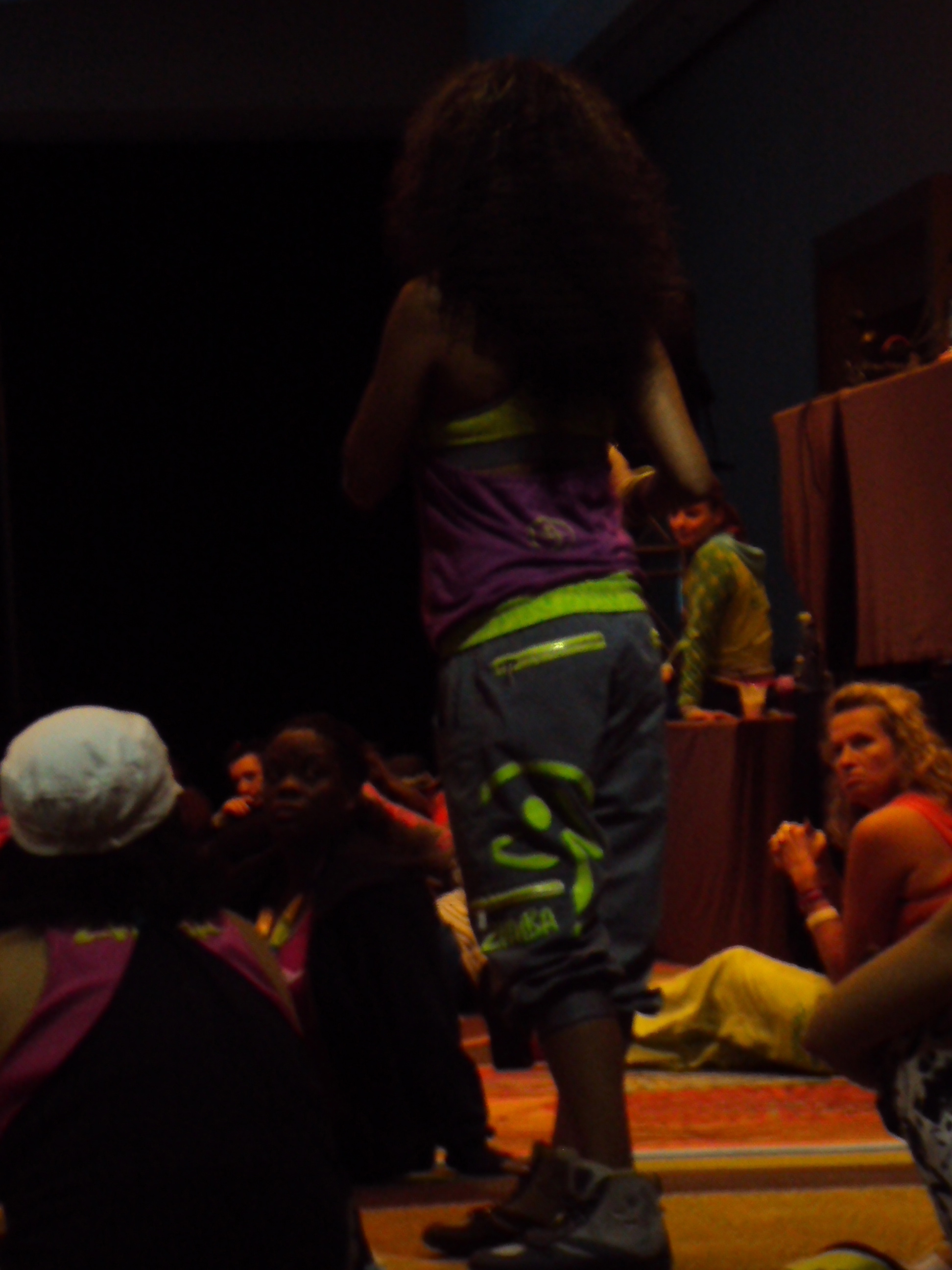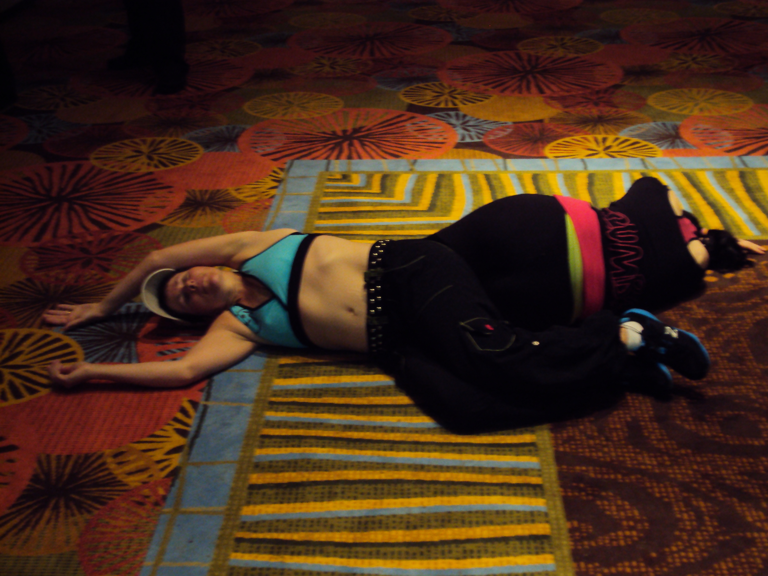 Here I’m wearing the black version of those tights – the glowing part on my leg actually says “Zumba” but it went crazy with the camera flash.  I’m also wearing one of the new bubble tops.  They came in black, lime green with instructor on the back, blue for aqua, gold for gold, and I think there were purple and pink versions for toning and Zumbatomic.  When we got to the store on the second day all the was left was XS/S (which was too tight for me even though my grey one from last year is S/M) and XL/XXL which is what I got.  SInce I’m so tall the bigger size works fine for me.