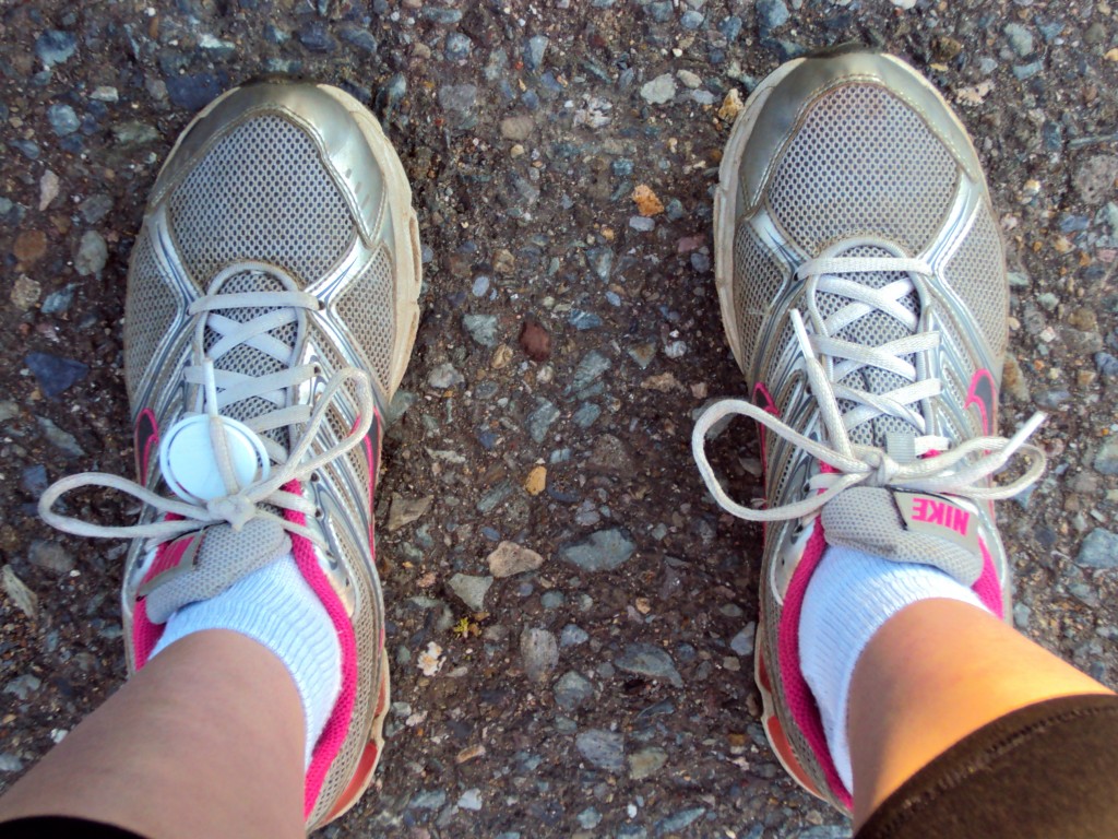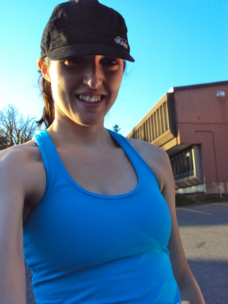 but notice my hat – that is not a running hat. The brim is way too tiny. Saturday night when I was getting my stuff ready I went looking for my favourite running hat, to no avail. I found my second favourite hat but when I turned it over…the inside was mouldy! EWWWWWWWWW. I told you it’d been a long time since I ran! Anyway, I ended up wearing this hat since it was going to be sunny and my running sunglasses are long gone so I needed something to keep the sun out of my eyes.