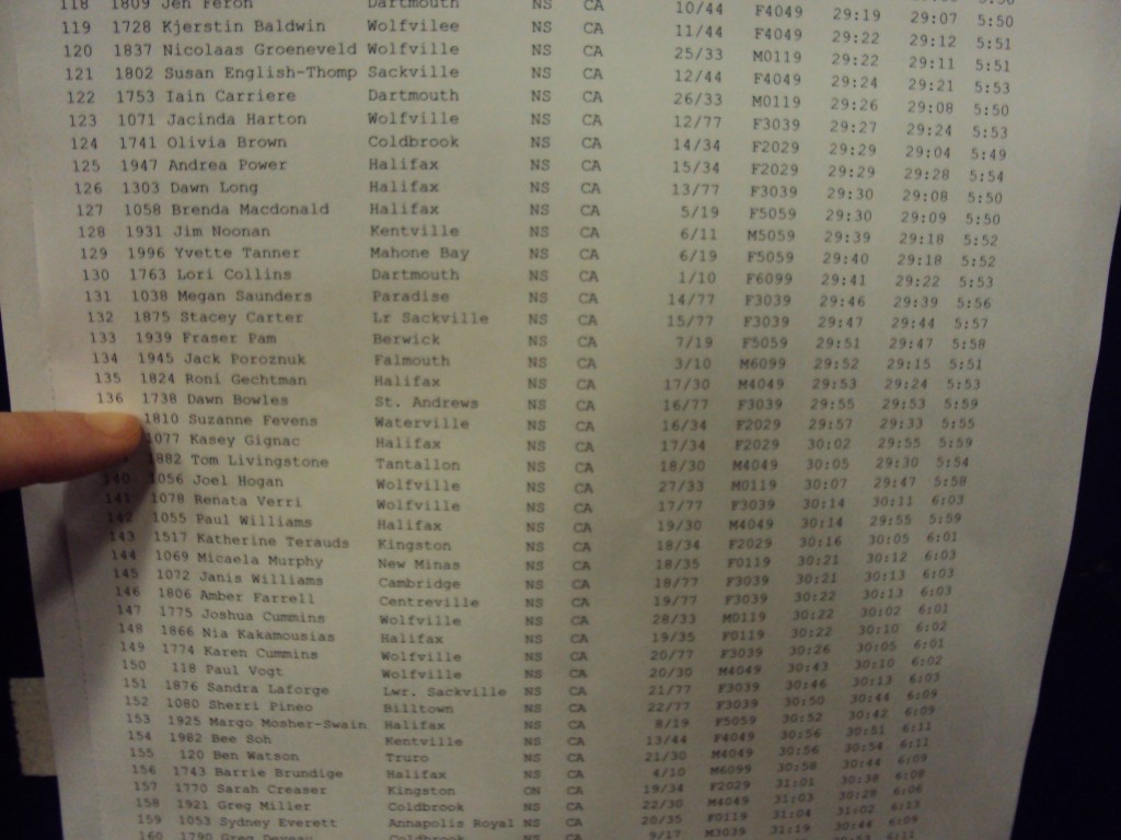 I knew I was close. We had started around 9:08 or 9:09, my watch said 9:39 when I finished. I had 38 minutes worth of songs on my iPod and when I finished there were still 2 songs left. I was close but I had to wait for the results to be posted before I would know for sure. That’s when I started thinking maybe I shouldn’t have taken that short break to get my water. If I missed my goal by a few seconds I was going to be seriously annoyed with myself.