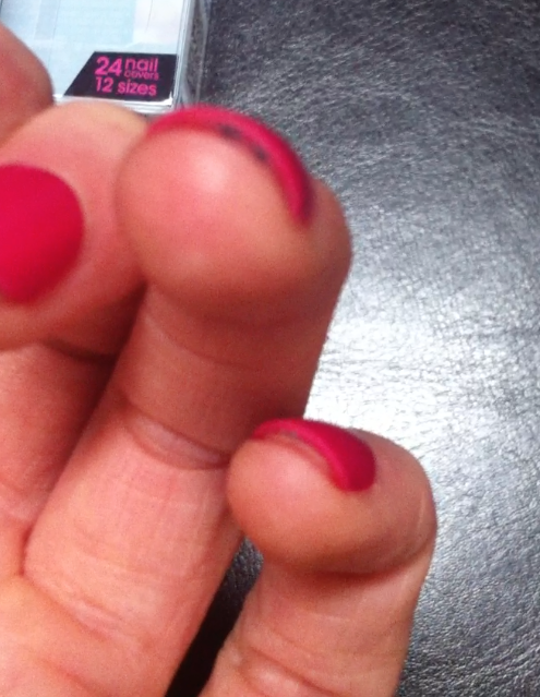 Now for my criticism. I will start off by saying that I’ve never had acrylic nails, so I’m not use to have “thick” nails, if you know what I mean. So I found it really difficult to pick things up, open cans of cat food, etc. with the nails on. My other criticism is that after a few days you start (or at least I did) to get these black adhesive “balls” under your nails, I guess as the adhesive holding the nail in place starts to wear off.