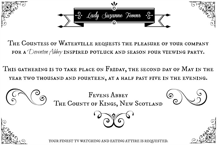 You’ll remember that in my last post we talked about themes and I unveiled my potluck theme was “Downton Abbey”, so in keeping with that I sent out these invites via email (I used picmonkey.com to make the invitations), and in the email I listed what people could bring to minimize confusion