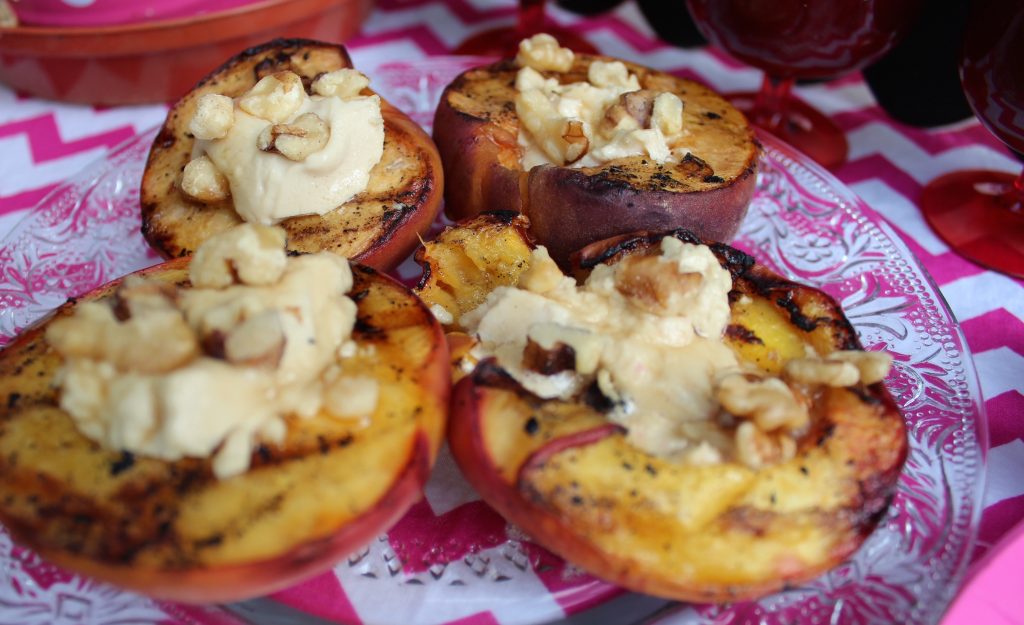 IMG_0020The reason I was a little sceptical is because I find goat cheese to be a bit hit or miss for me. Either I love it and don’t know the difference, or I find it tastes, well, goat-y. So I was a tad leery to try these when it came time for dessert but you know what? DELICIOUS! Had someone told me it was regular cream cheese with a maple flavour I would have believed them. I might feel different having it with another dish but pared with the grilled peaches and walnuts it is a home run. A home run I intend to hit again. 😉