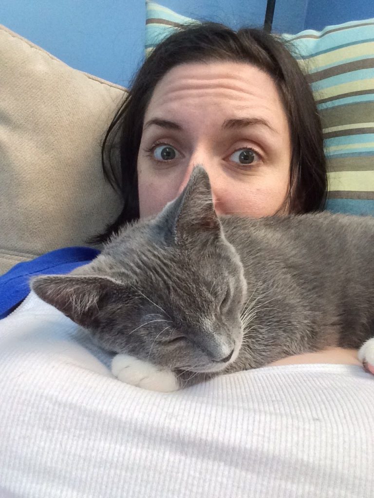 They are sisters and were 4 months old when we got them. Both have double paws. One of their parents must have been a Russian Blue and the other a black and white tuxedo kitty as all of the kittens in the litter were either grey/grey & white/ black & white. Of course after Ollie I really wanted another Russian Blue as they are so lovey and I’m so happy we were able to get a pair of sisters with Russian Blue blood. 🙂