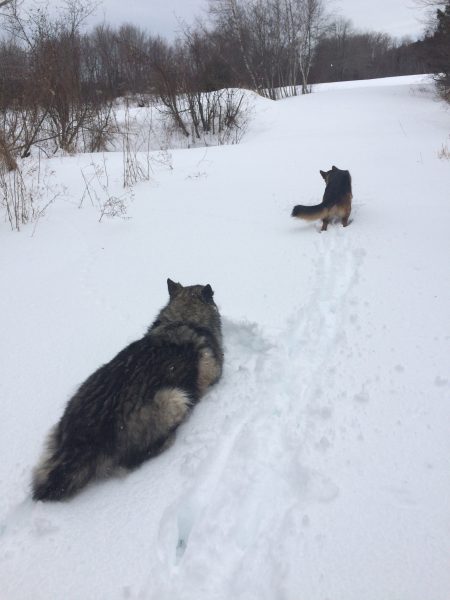 Tucker and Bosco bravely leading the way. The snow was perfect for my first time out in my snazzy new snowshoes,