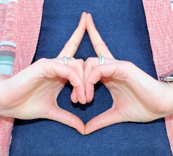 This funny looking heart is actually a mudra, Kalesvara Mudra to be specific. Think of a mudra like yogi sign language. This one is meant to help you clear conflicting thoughts, helps to make us calmer and encourages optimistic change. And personally, I think the mudra for optimistic change is a wonderful heart shape for this campaign!