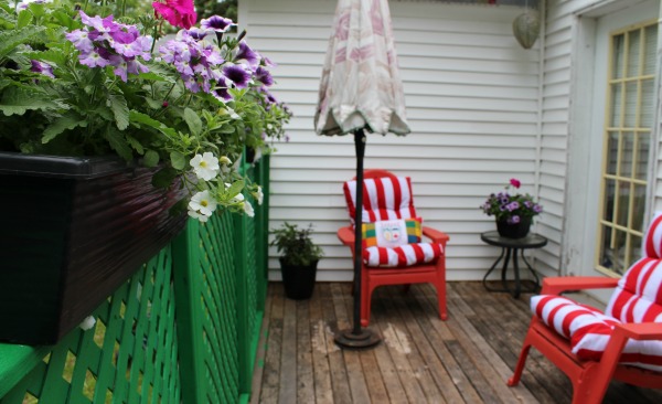 Your deck looks great with all of the fresh paint and beautiful flowers. I think I would use the gift card for some comfy cushions for my deck chairs and perhaps a hanging basket.